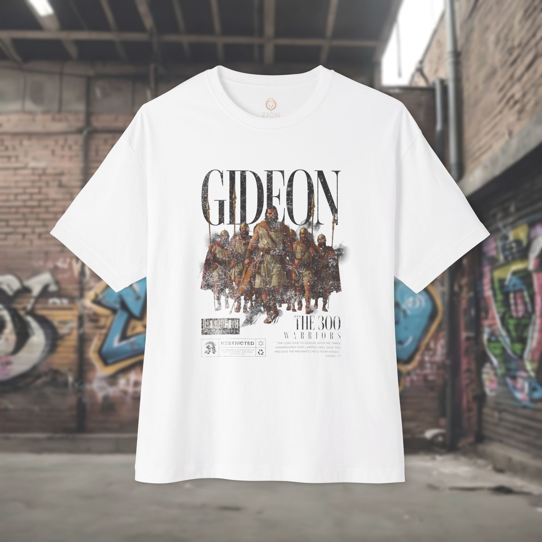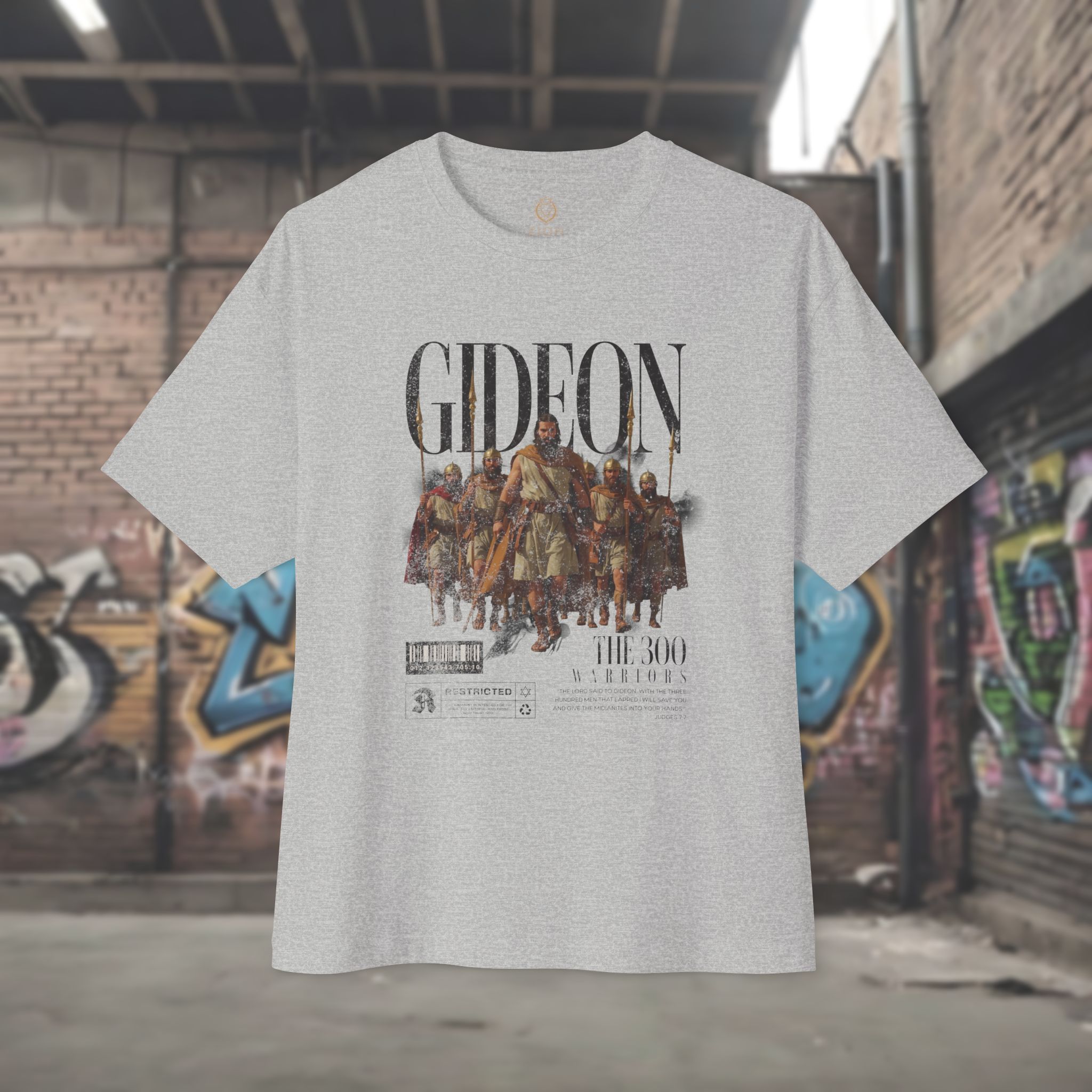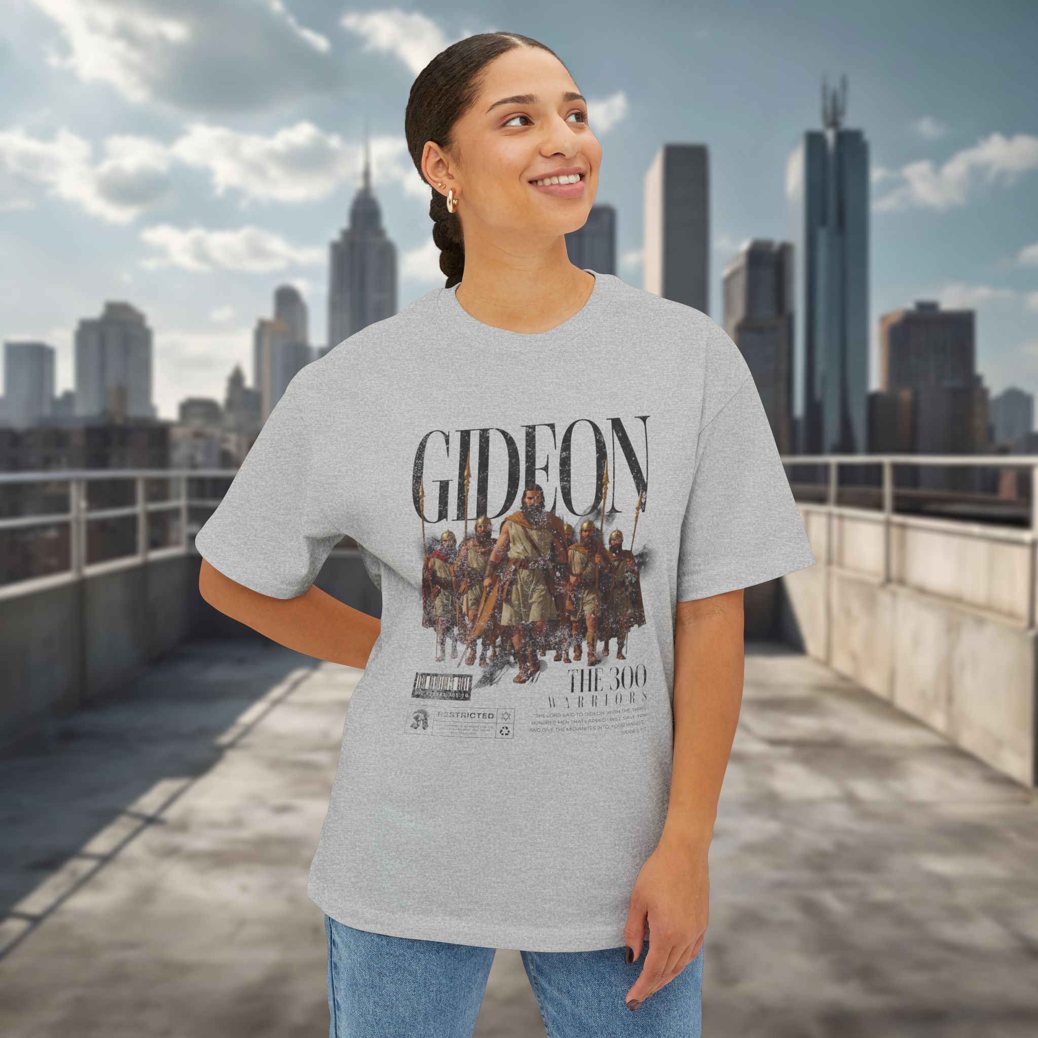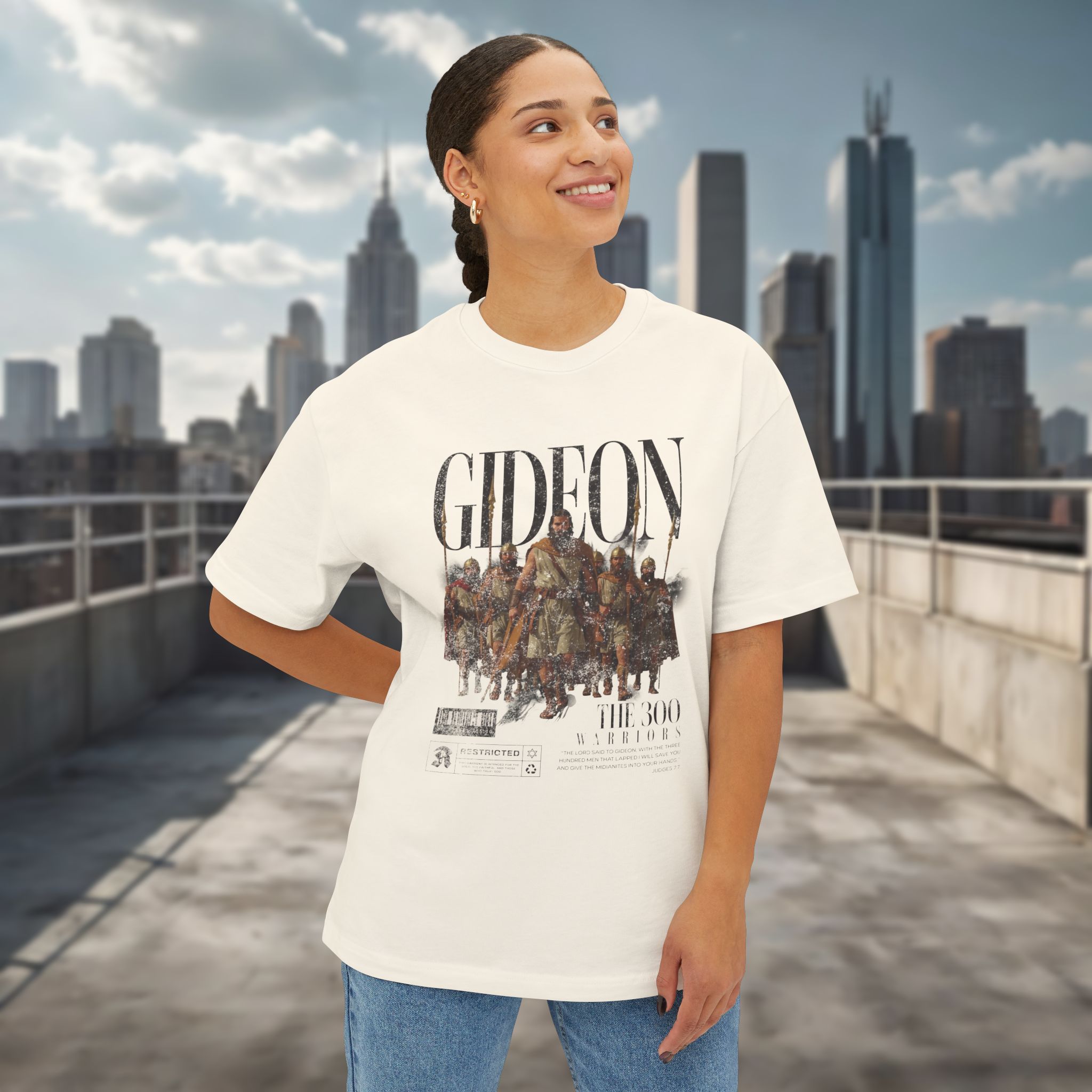 This oversized boxy tee draws inspiration from the story of Gideon and the three hundred, reflecting themes of courage, purpose, and trust beyond numbers